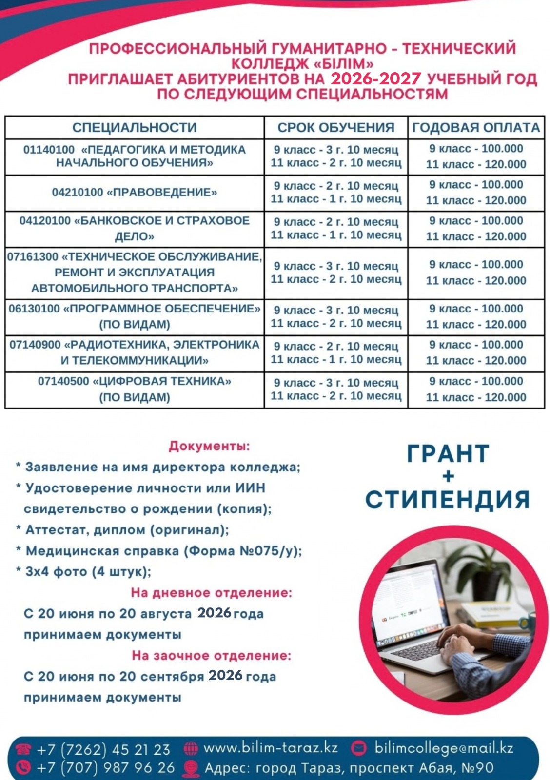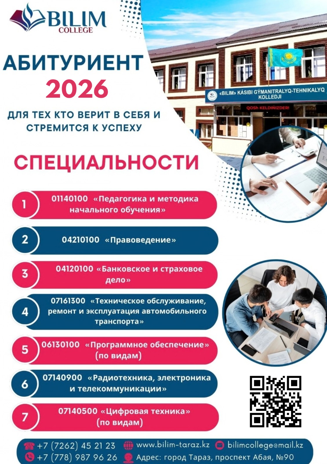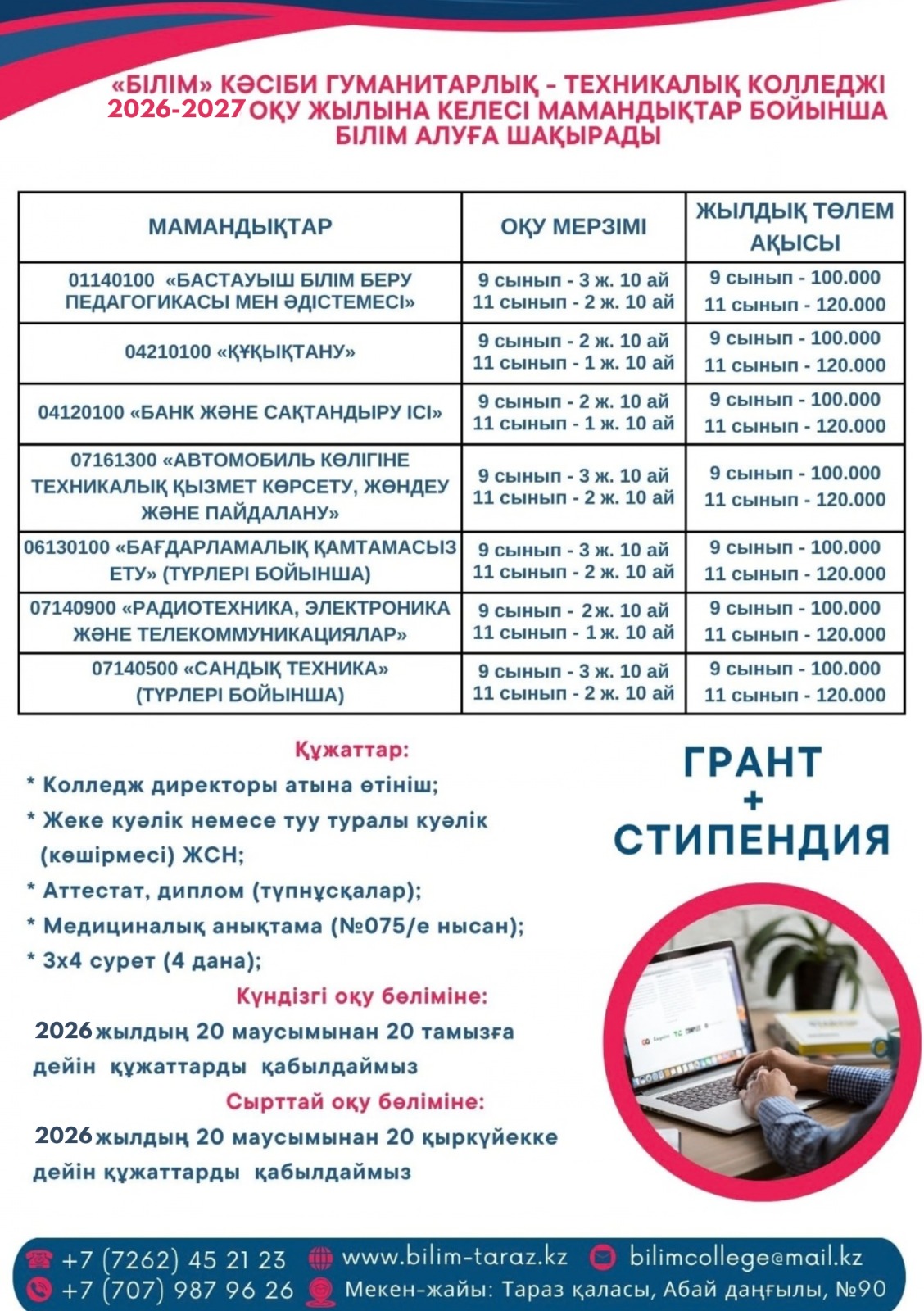 Колледж мекен-жайы: Қазақстан Респубилкасы,Тараз қ., 080000, , Aбай даңғылы,90. Тел: 8(726) 45-21-23, 87016669307,email: bilim_2030@mail.ru